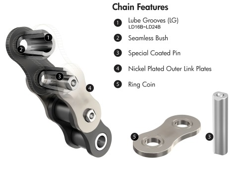 · LD16B及以下尺寸的連接鏈節(jié)是開口銷型,而對(duì)于LD20B到LD2B尺寸則是開口銷類型。 · 可以根據(jù)要求提供額外尺寸、多排鏈條以及帶特殊附件的鈦鏈條 |