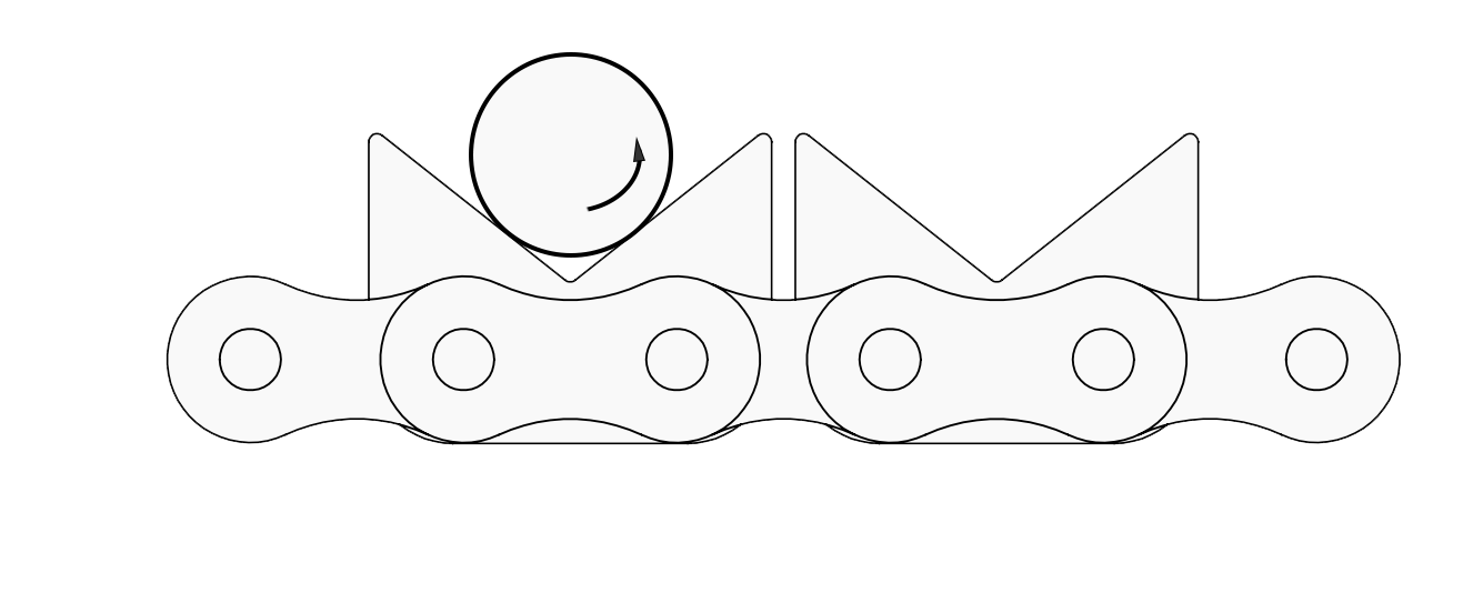 插板鏈的附件的“V”字型凹槽可卡住像安瓿瓶這類(lèi)圓柱形貨物讓其無(wú)法自由移動(dòng),然后隨著鏈條的移動(dòng)將其運(yùn)輸。