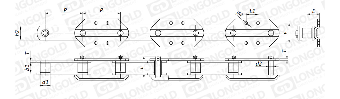 帶有 BGA4 附件,即鏈條一側(cè)的鏈板上下各有一個(gè)折彎板,折彎板各帶兩個(gè)孔,但與SGA4附件有所不同,BGA4附件的附板形狀為梯形。