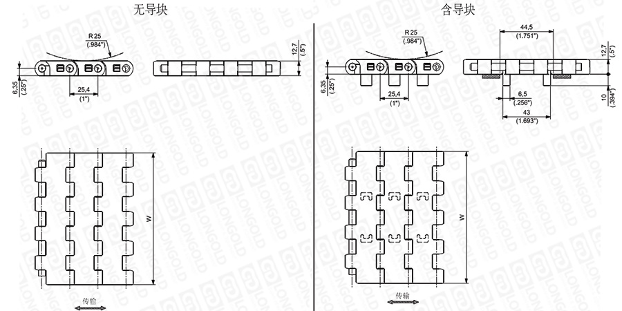 上圖為1"節(jié)距重載鏈板 USP系列,圖紙中已標(biāo)明部分尺寸。
