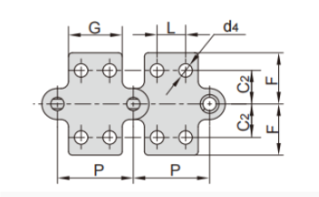 上圖為S滾子鏈雙倍節(jié)距鏈帶附件圖,R滾子型的附件尺寸也與其相同。