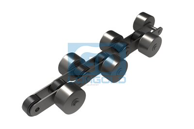 圖示為按交錯型每一個鏈節(jié)安裝側(cè)置滾輪例。 交錯型每個鏈節(jié)帶側(cè)置滾子時,安裝塑料制動滾輪,以每三個鏈節(jié)(圖例中畫斜線的側(cè)置滾子對應(yīng)的鏈節(jié))為標(biāo)準(zhǔn)。