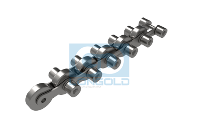 與中心滾子鏈相比,在雙節(jié)距傳動鏈條的基礎(chǔ)上加大鏈條滾子直徑,且兩側(cè)的銷軸可以延長,在延長部分加裝側(cè)置滾輪使用,形式更加多樣化,可以滿足不同工種場合的使用需求。