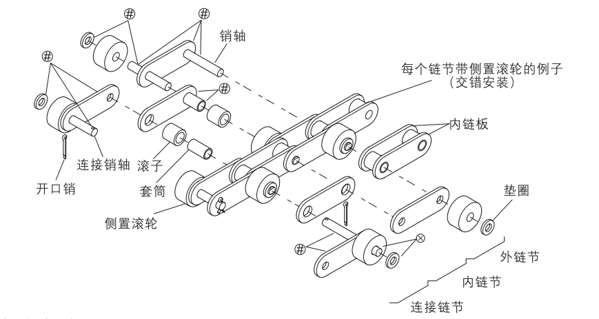 圖是按對稱形每兩個鏈節(jié)帶一個側置滾輪的例子。 對稱形每兩個鏈節(jié)帶側置滾輪時,安裝塑料制動滾輪,以每六個鏈節(jié)(圖例中畫斜線的側置滾子對應的鏈節(jié))為標準。