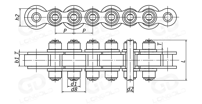 與中心滾子鏈相比,在短節(jié)距傳動(dòng)鏈條和雙節(jié)距傳動(dòng)鏈條的基礎(chǔ)上加大鏈條滾子直徑,且兩側(cè)的銷軸可以延長(zhǎng),在延長(zhǎng)部分加裝側(cè)置滾輪使用。