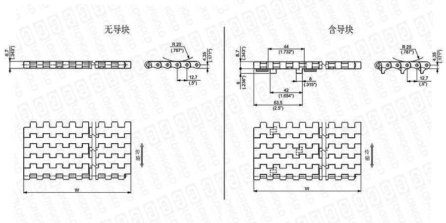 上圖為1/2"節(jié)距網(wǎng)帶與鏈板 610系列的結(jié)構(gòu)圖,圖紙中已標(biāo)明部分尺寸。