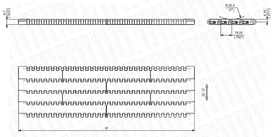 上圖為3/4"節(jié)距中載網(wǎng)帶與鏈板 7300系列,圖紙中已標(biāo)明部分尺寸。