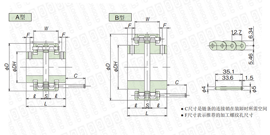 該類鏈條聯(lián)軸器安裝時可容許誤差與標(biāo)準(zhǔn)型比較擴大近2倍,請參照型號表里的規(guī)格進(jìn)行訂購。