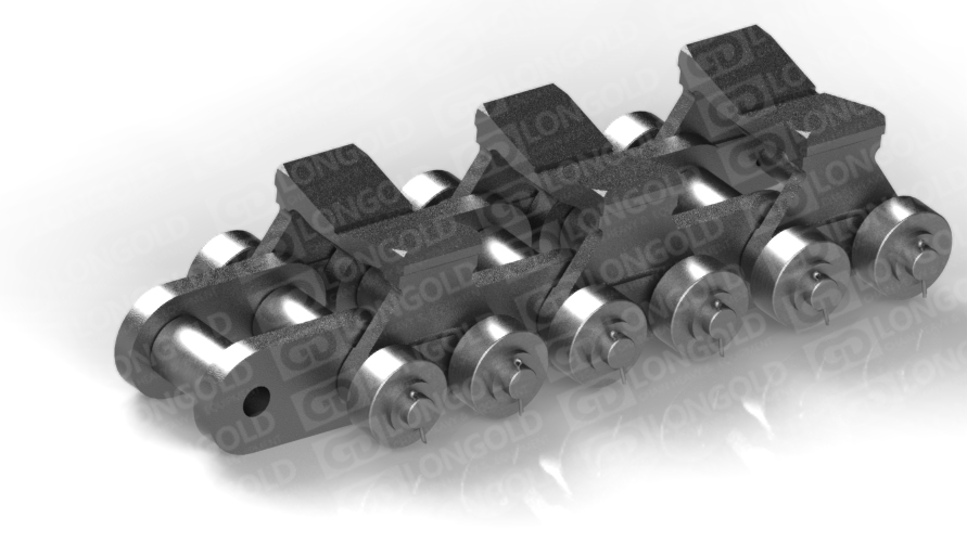依靠鏈板底部底座附帶的折彎板上的孔將鏈條固定,能防止鏈條在運輸過程中出現(xiàn)抖動蛇形等情況,同時鏈板為直板型,方便鋼材的放置和運輸。
