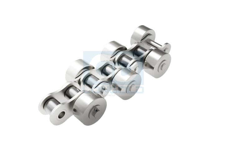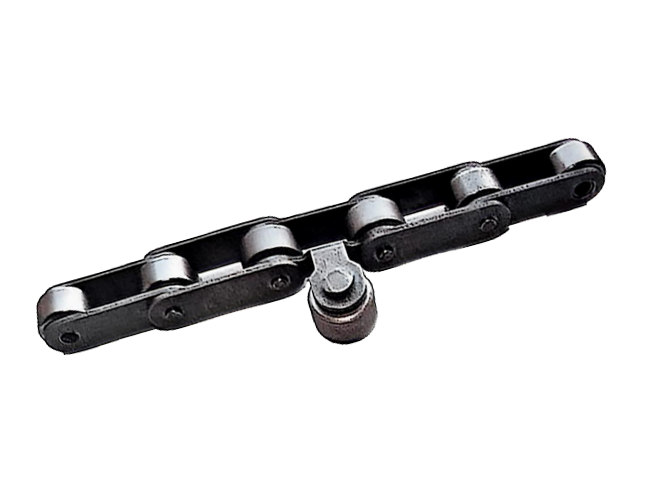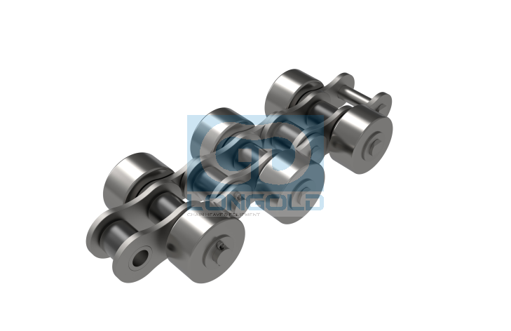帶側(cè)置滾子鏈條,是延長雙倍節(jié)距或短節(jié)距滾子鏈條的銷軸,然后安裝自由旋轉(zhuǎn)的側(cè)置滾子的輸送鏈條。