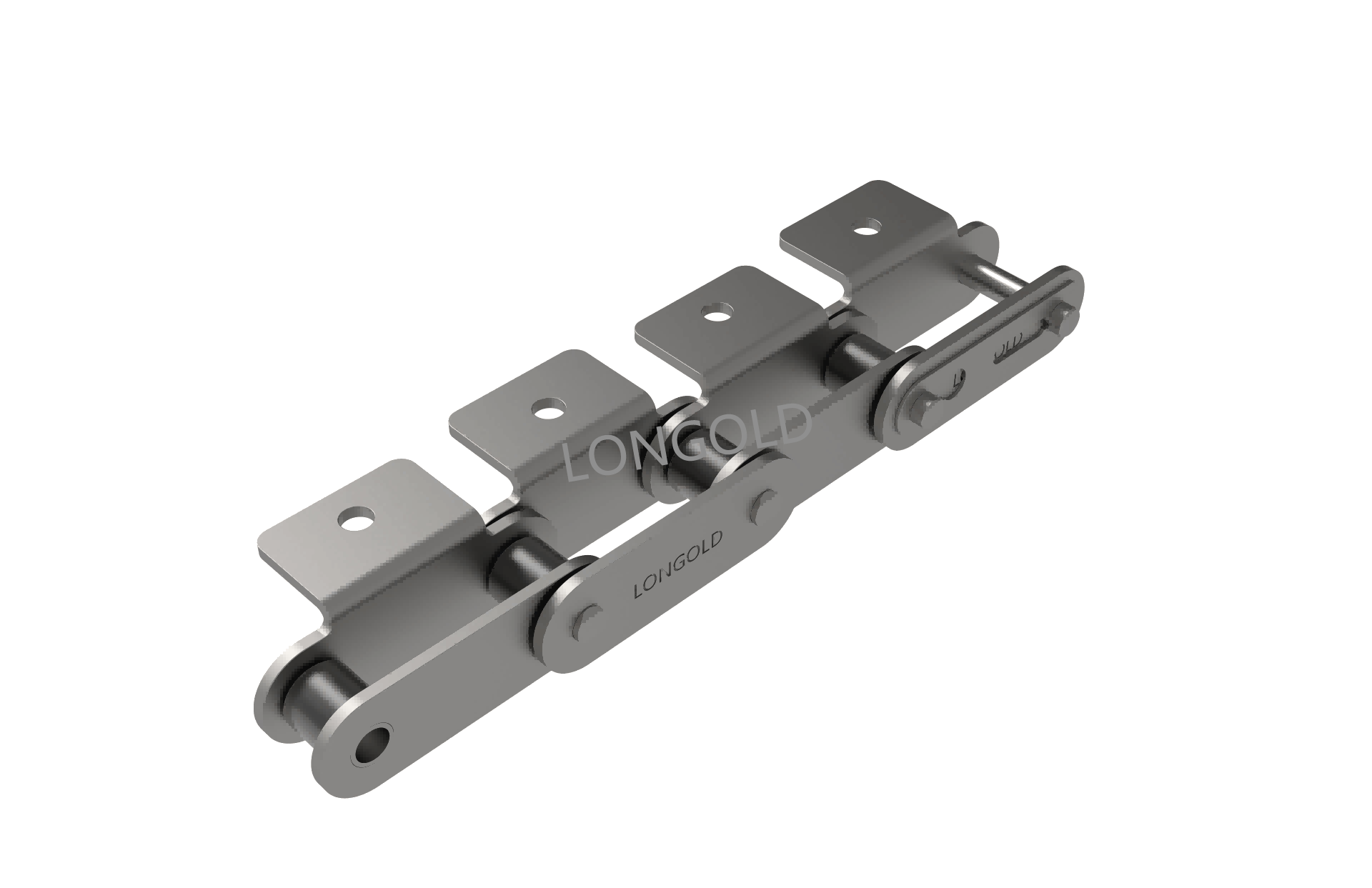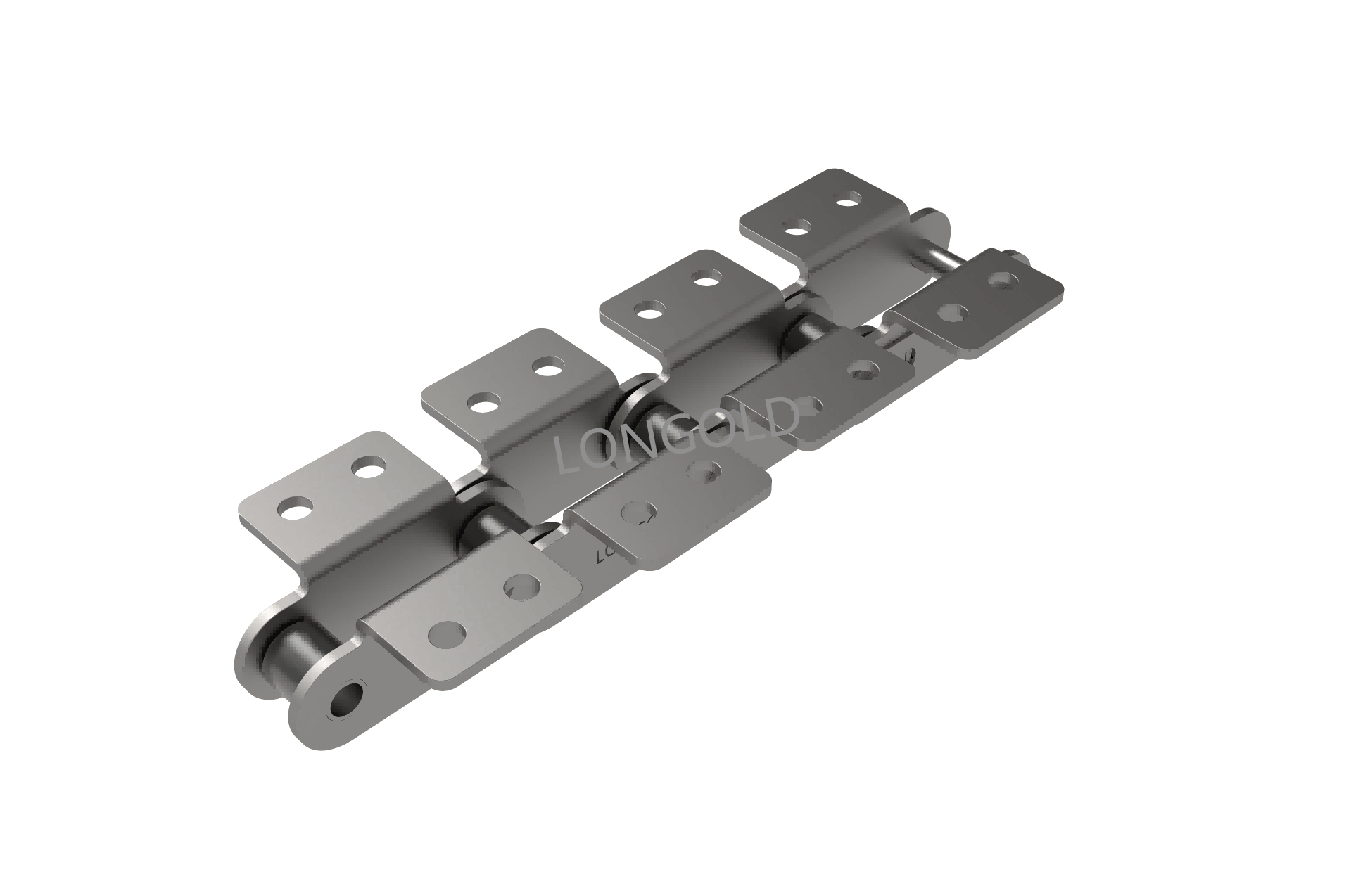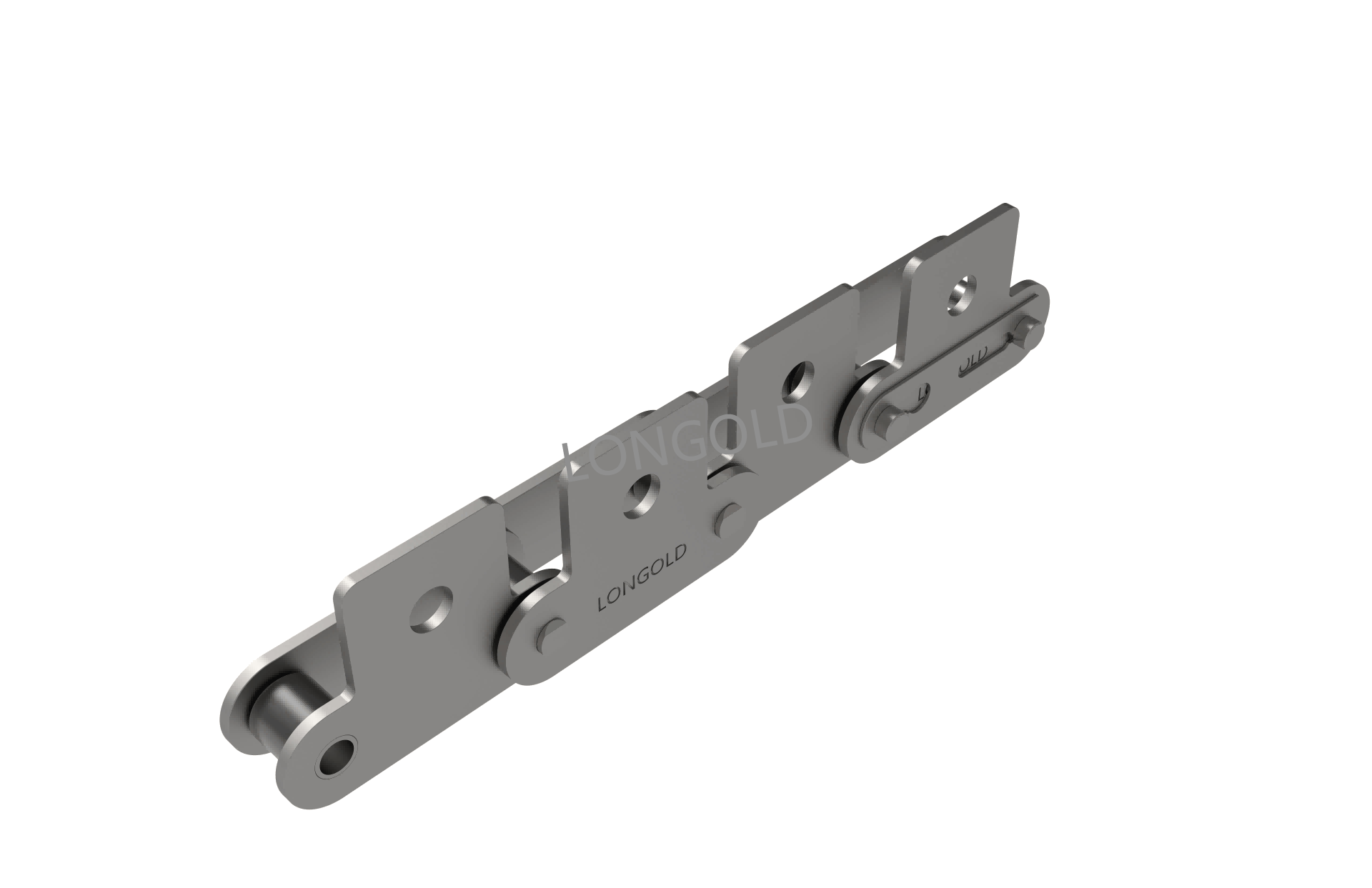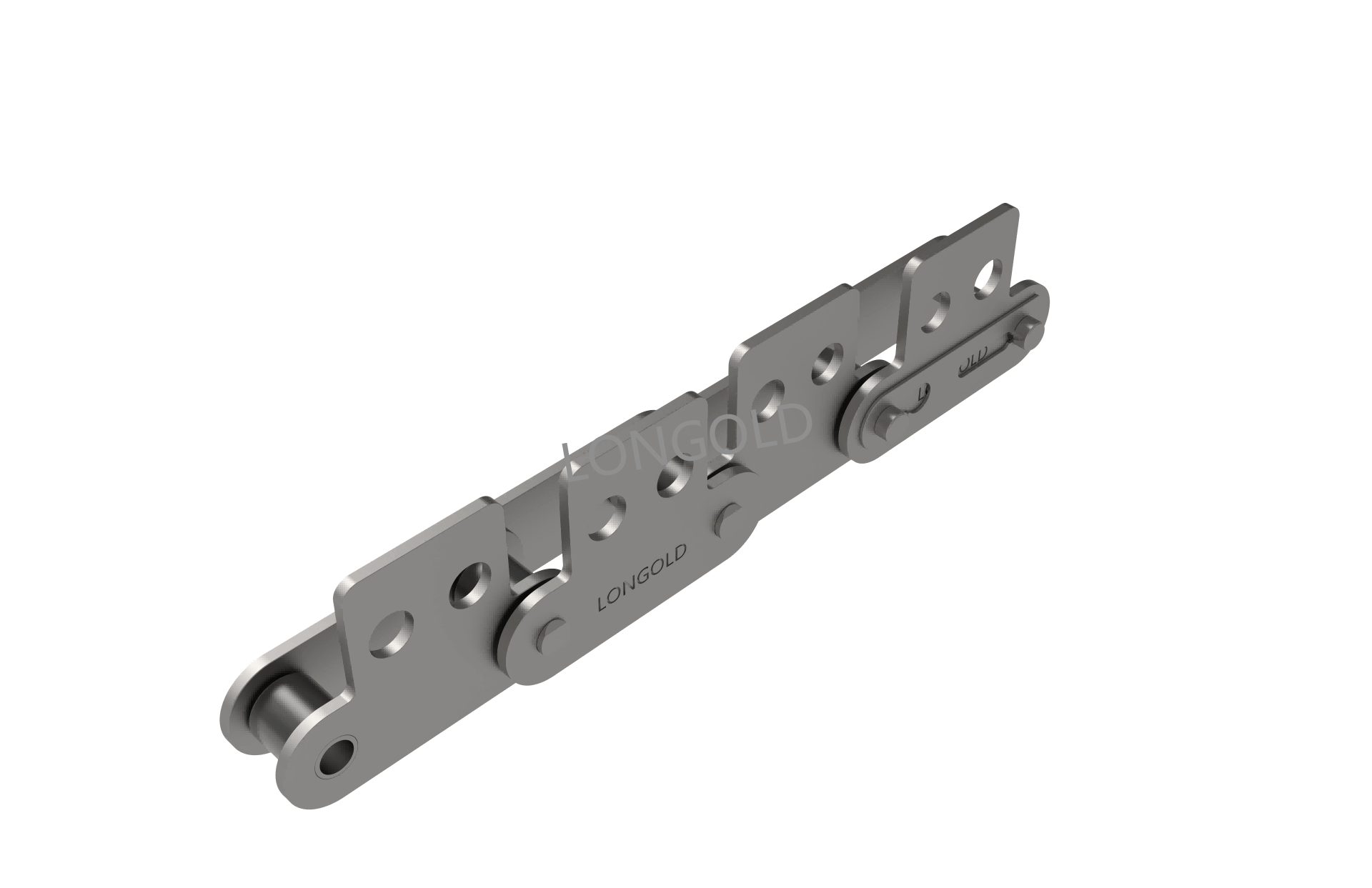 與短節(jié)距A系列滾?鏈條相?,鏈條節(jié)距增加1倍(稱為雙倍節(jié)距),鏈板形狀為直板形,鏈條的滾子分為S型滾子和R型滾子,且?guī)Ц郊妮斔?鏈條。