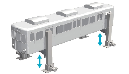 電車檢修時,可使用4臺提升機(jī)將車體抬起。 |