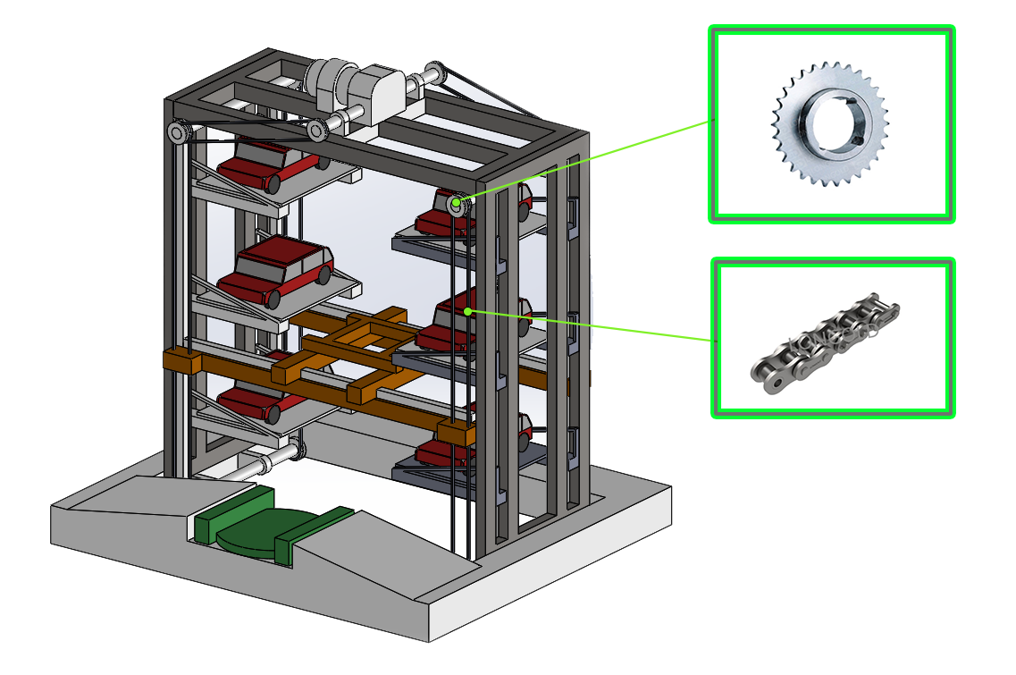 在立體停車(chē)場(chǎng)中,車(chē)輛通過(guò)載車(chē)板的升降和橫移進(jìn)行存取。下層車(chē)位可直接存取車(chē)輛,上層車(chē)位需將下方車(chē)位橫移讓出空間后,通過(guò)升降裝置(鏈條和鏈輪作為主體)將車(chē)輛存入或取出。