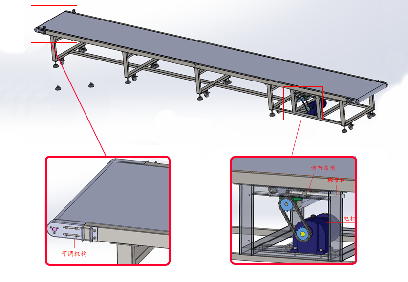 皮帶輸送機(jī)將電機(jī)轉(zhuǎn)動的動力通過傳動裝置(傳動鏈和鏈輪)帶動輸送帶在滾筒之間轉(zhuǎn)動,從而對將物品從一端輸送到另外一端。 |