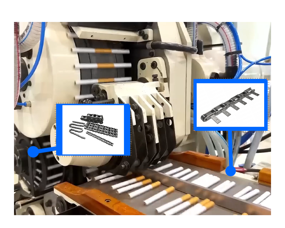 煙草機(jī)械輸送鏈條參與成品與包裝的輸送,傳動(dòng)鏈驅(qū)動(dòng)包裝機(jī)械進(jìn)行包裝。 |