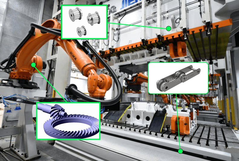 沖壓件在沖壓完畢后需要移到下一工位,為保證機(jī)械臂更便捷的移動(dòng),機(jī)械臂上的動(dòng)力傳輸除液壓外還會(huì)用到隆德生產(chǎn)的齒輪進(jìn)行輔助移動(dòng)。 |