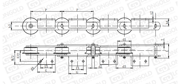 鏈條帶A2附件,即鏈條一側(cè)帶折彎板,折彎板上帶兩個(gè)孔。