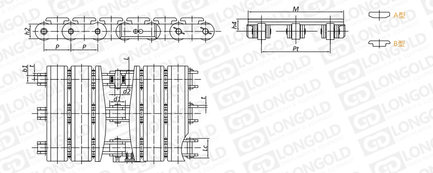 鏈條本體滾子類型有大滾子和帶F型邊滾子,鏈條的節(jié)距多為非標(biāo)節(jié)距。