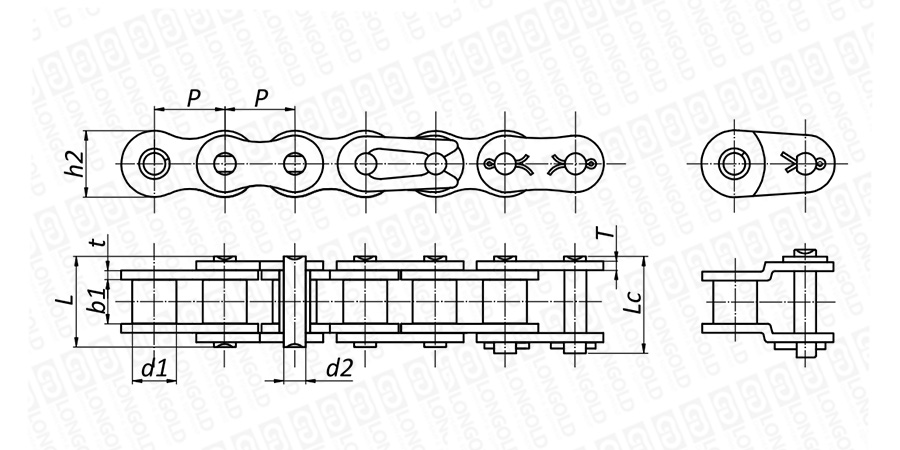 上圖為單排不銹鋼短節(jié)距B系列滾子鏈本體的結(jié)構(gòu)圖。