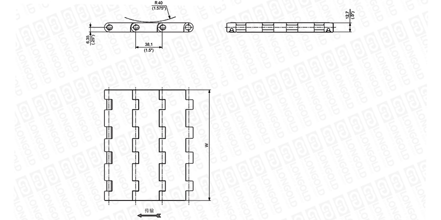 上圖為1 1/2"節(jié)距重載鏈板 UCC系列的結構圖,圖紙中已標明部分尺寸。