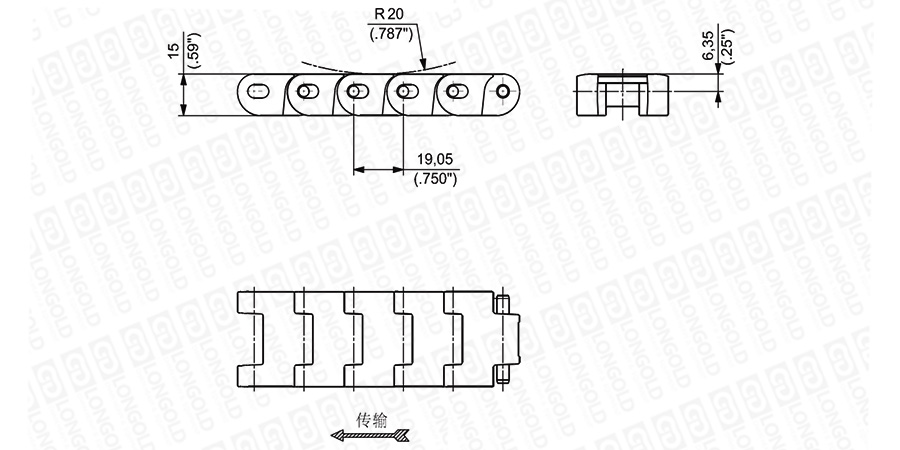 上圖為3/4"節(jié)距重載鏈板 UCC 138系列的結(jié)構(gòu)圖,圖紙中已標明部分尺寸。