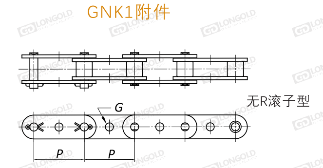GNK1附件,僅可作為雙節(jié)距S型滾子附件鏈使用,R型滾子不能與GNK1附件結(jié)合使用,因為滾子和鏈節(jié)板上的孔之間會產(chǎn)生干擾。