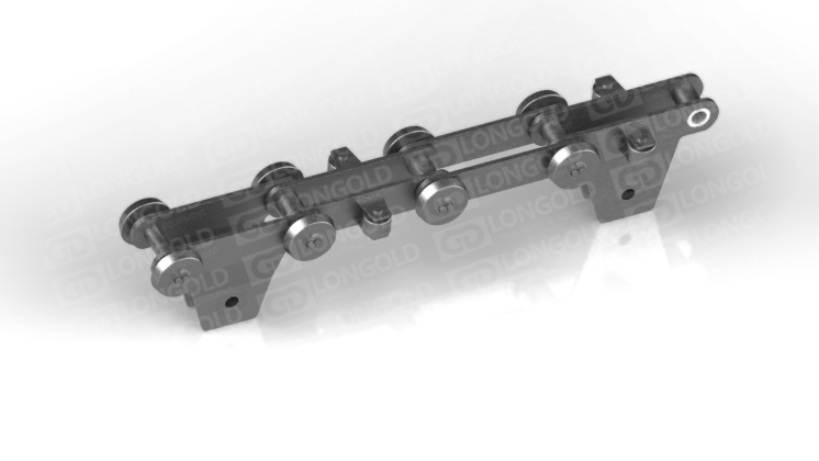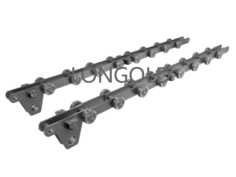 帶側(cè)置滾輪的汽車汽車生產(chǎn)線鏈條,側(cè)置滾輪能減少鏈條運(yùn)動(dòng)時(shí)的摩擦阻力,使鏈條能夠更加順暢地在軌道上運(yùn)行。