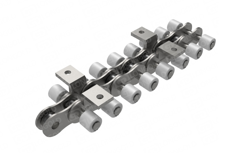 支盒機(jī)支盒成品輸送鏈?zhǔn)且环N特殊設(shè)計的輸送鏈條,它在鏈條的兩側(cè)都裝有塑料滾輪,這些滾輪可以減少摩擦,提高輸送效率,并且降低噪音。