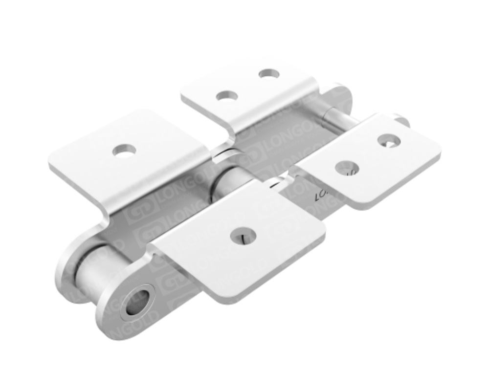 鏈條節(jié)距為標準傳動用滾子鏈的2倍,適用于長距離的物料輸送。不銹鋼鏈條具有良好的耐腐蝕性能??墒褂脺囟葏^(qū)域從-20°C到400°C。鏈條單側鏈板上下延伸,延伸的附板成為附件,附板上帶1個或2個螺孔,附件表示為:SAA1、SAA2。