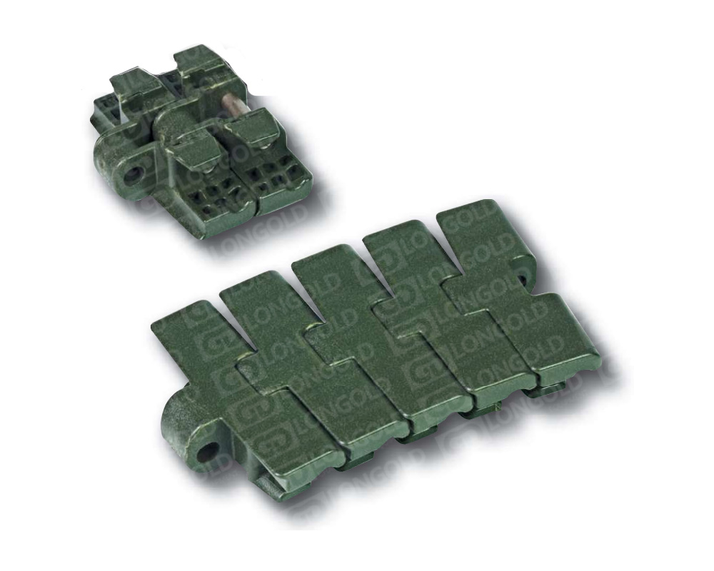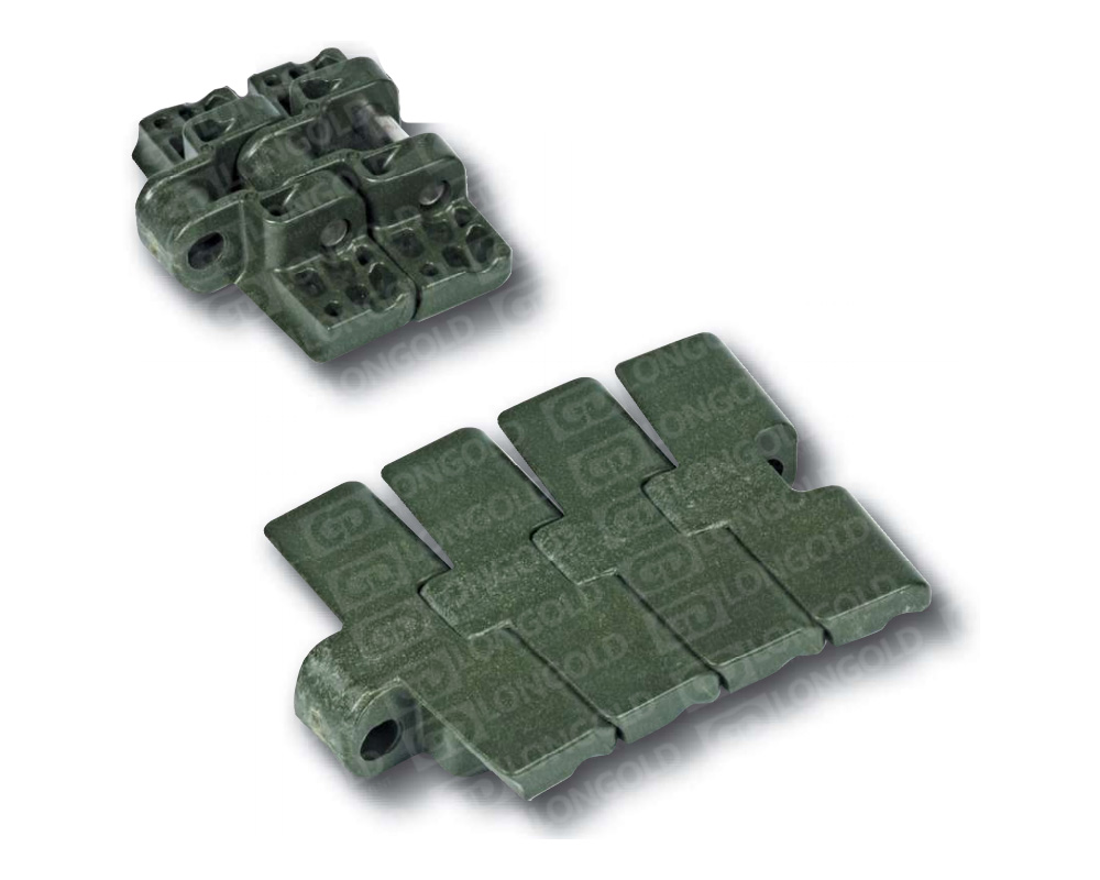 鏈板通常采用工程塑料材質(zhì),這些材料具有較高的強(qiáng)度、耐磨性和耐腐蝕性。鏈板可進(jìn)行橫向彎曲,適用于曲線輸送