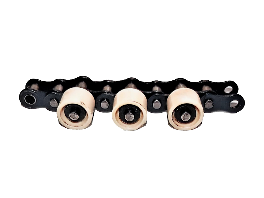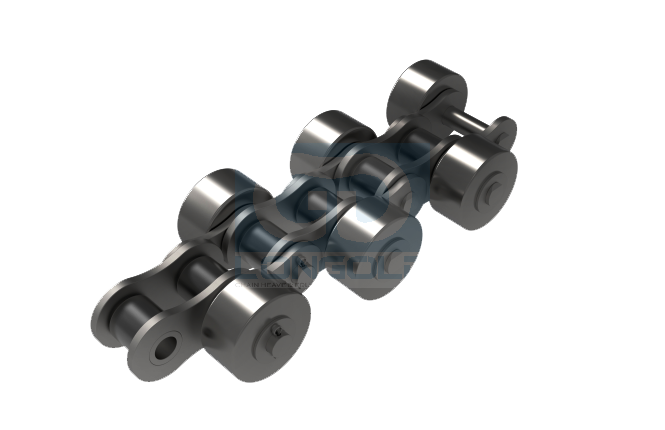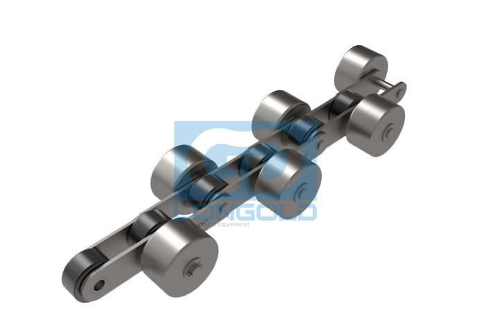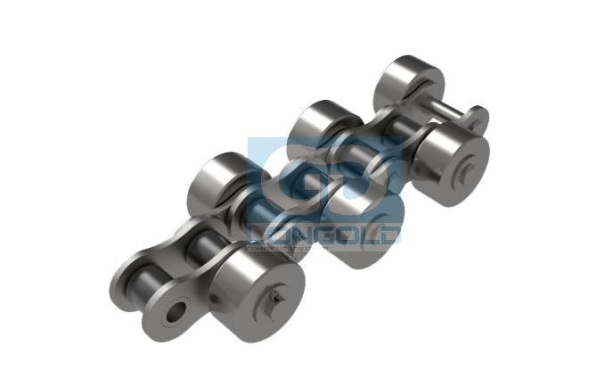 帶側(cè)置滾子鏈條,是延長雙倍節(jié)距或短節(jié)距滾子鏈條的銷軸,然后安裝自由旋轉(zhuǎn)的側(cè)置滾子的輸送鏈條。