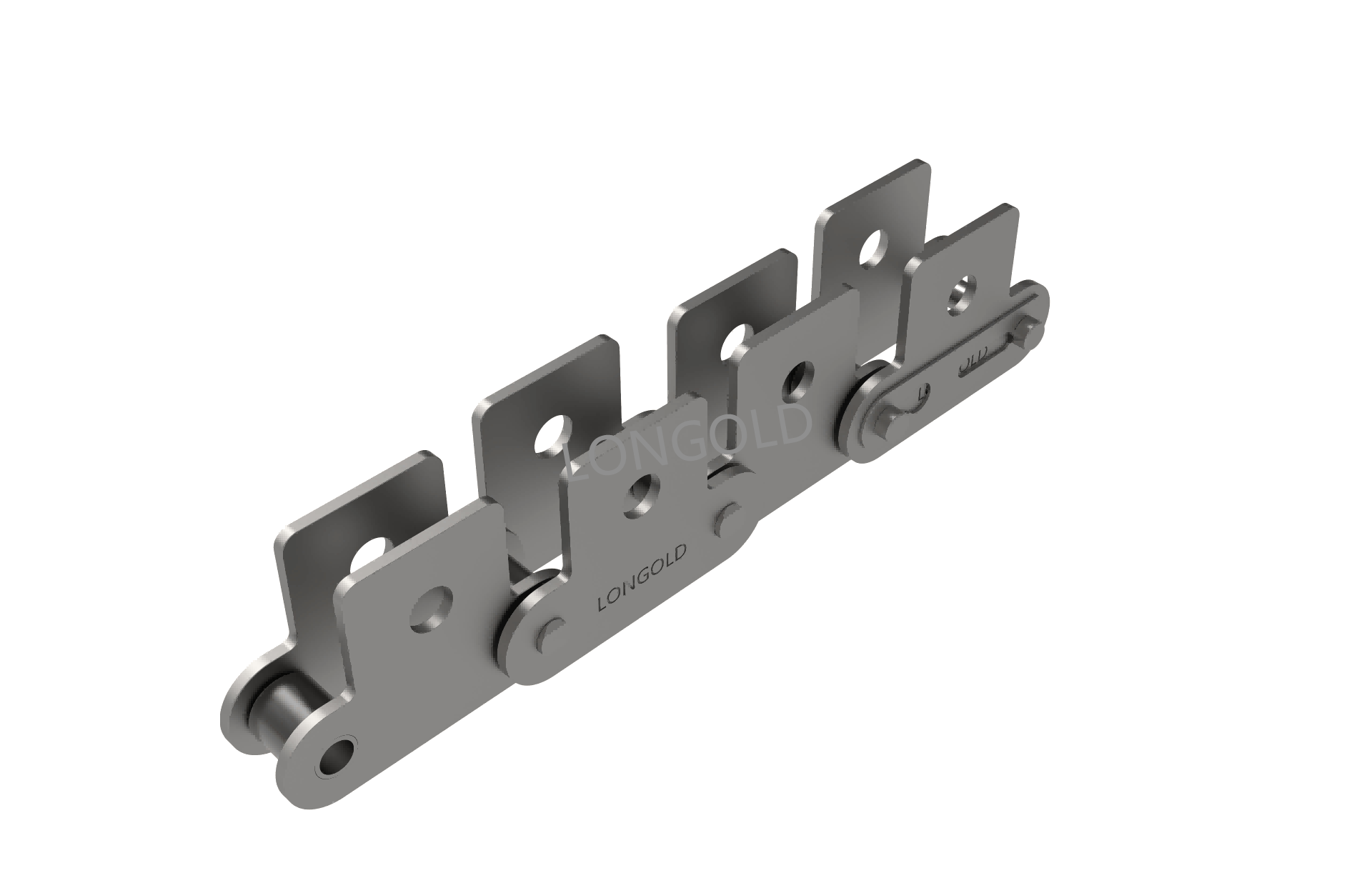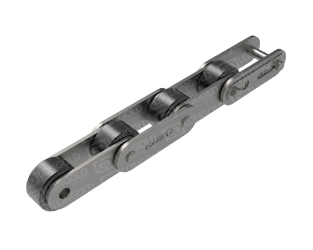 與短節(jié)距A系列滾?鏈條相?,鏈條節(jié)距增加1倍(稱為雙倍節(jié)距),鏈板形狀為直板形,鏈條的滾子分為S型滾子和R型滾子,且?guī)Ц郊妮斔?鏈條。